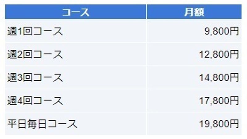 必要なのはレッスン料だけで、入会金・教材費はかかりません。決まったスケジュールで受講するなら、週1回コースから平日毎日コースまでの定額コース(月謝制)がおすすめ。おためしならレッスンチケットで1回から受講することも可能です。