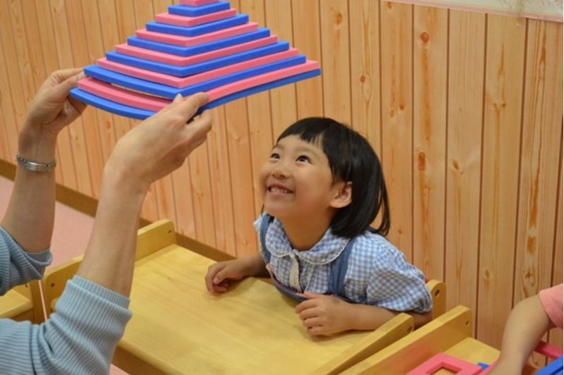 ピラミッドや、首飾りづくり、いとぬ(イラスト付きのカード)と言った教材を使って、図形の大小の理解や、図形を組み立てるための基礎的な能力を養います。