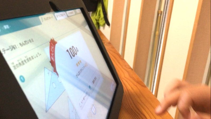 単元の途中からは応用問題が出るので一気に難しくなります。息子が間違えてしまうと「何で間違えたかわかるかな?」と先生は自力での解決を促します。息子が無言で悩んでいると「じゃあ一緒に考えてみようか」と、先生はタブレット画面に書きこみをしながら解説。すらすらと文字が浮かび上がるので集中して見ています。