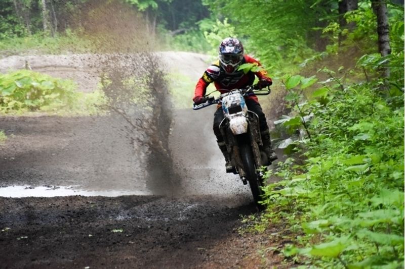 オートバイ競技の1つ。オフロードのでこぼこしたコースをオートバイで走ります。