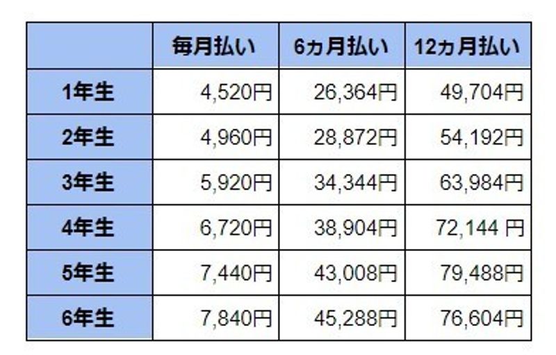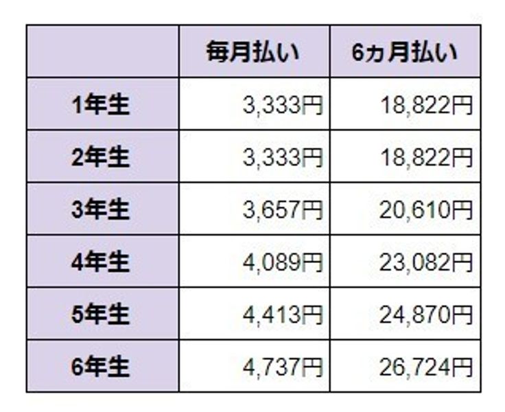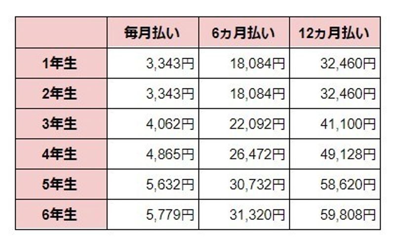 Gambaエースは、1~2年生は4教科、4~6年生は5教科の受講費となっています。受講費は、全学年共通です。
