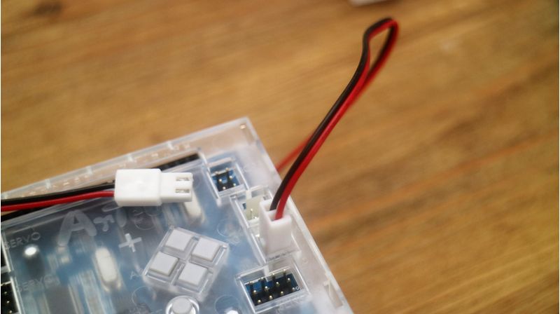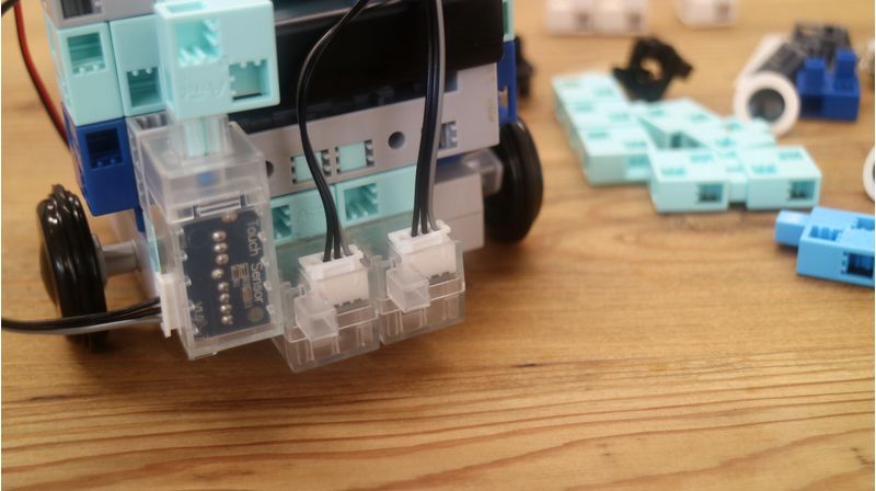 組み立て説明書を見ながら、ブロックを組み立てた後は、コードで基盤とセンサーをつなげていきます。こちらも、配線の向きなどを間違えないよう線の色に注意して取り付けていきましょう。