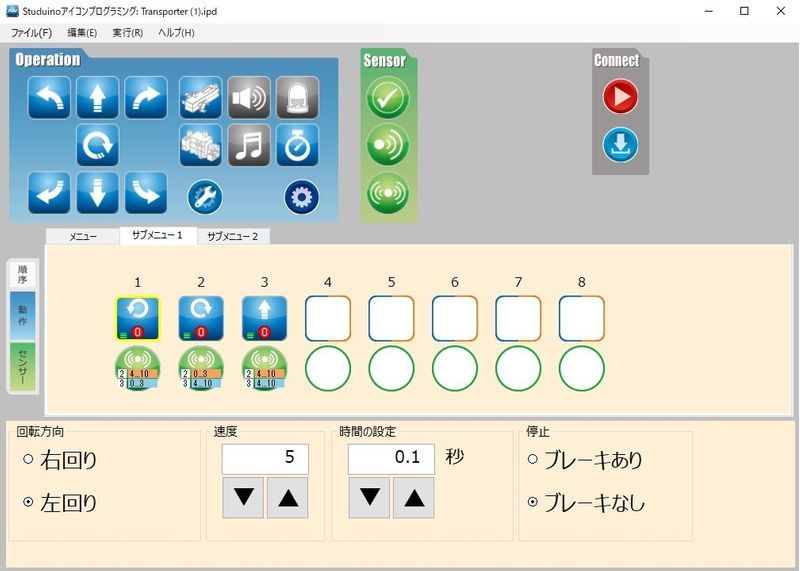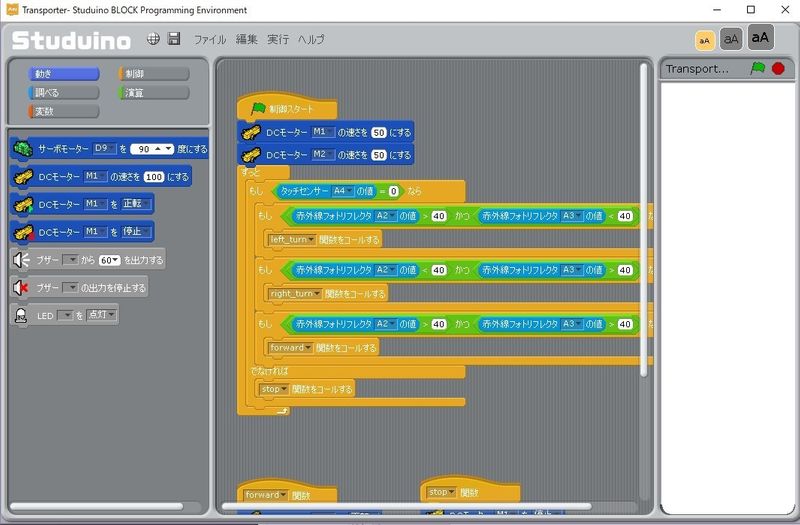 なんとなく、トランスポーターロボットが動いた命令の中身がわかったでしょうか?とてもシンプルな命令で3つのセンサーをフル稼働して動いているのですね。