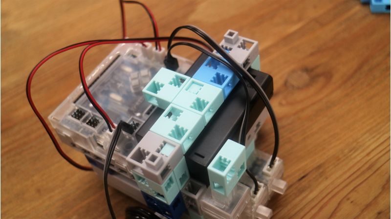 ブロックとブロック型のセンサーやモーターを組み合わせてロボットを組み立て、自分の作ったプログラミングで動かすことができます。