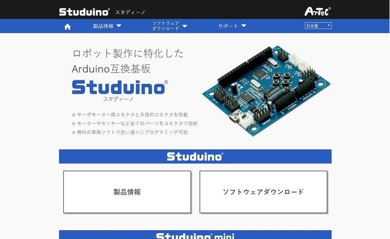 アーテックロボのサイトからリンクされている「スタディーノ(Studuino)」のサイトから、必要ソフトやドライバをダウンロードし、マニュアルを参考にしながらパソコンにインストールしましょう。