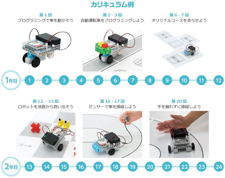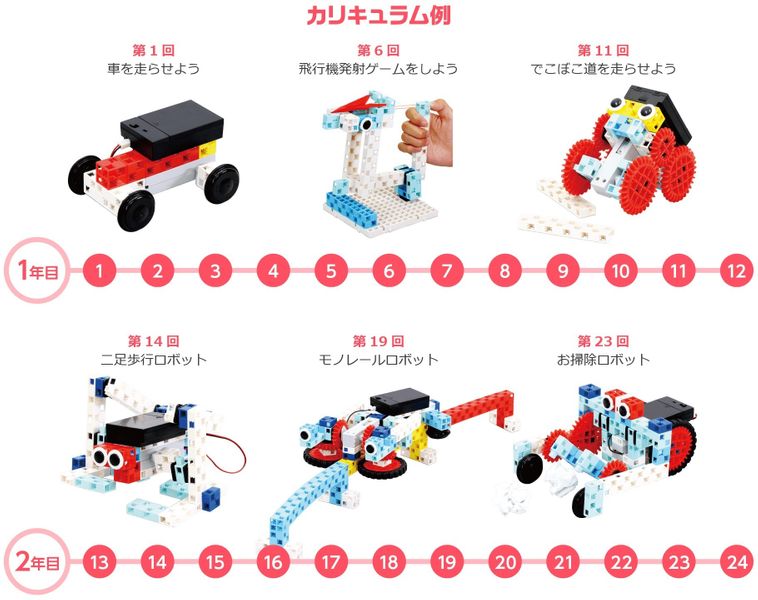 小学1年生から3年生までの低学年を対象としており、「パズル」「ロボット」「ブログラミング」の3つのカリキュラムを2年間のコースで楽しく学びます。