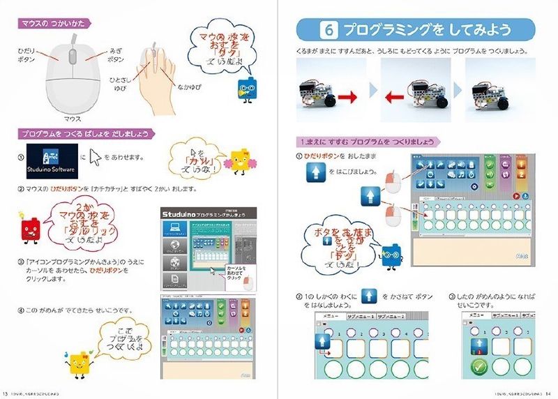 楽しくわかりやすく学べる秘密は、カラーでわかりやすくていねいに解説されたテキストにもあります。これからつくるものが「実際の生活ではどのように活用されているのか」「どんな仕組みで動いているのか」をしっかりとテキストを用いて教えてくれるので、明確な目的に向かって試行錯誤することができるのです。