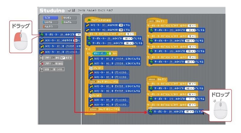 プログラミングは、難解な言語は必要としません。プログラミングの部品アイコンをマウスでドラッグ&ドロップして組み合わせるだけ。子どもでも簡単に操作できます。