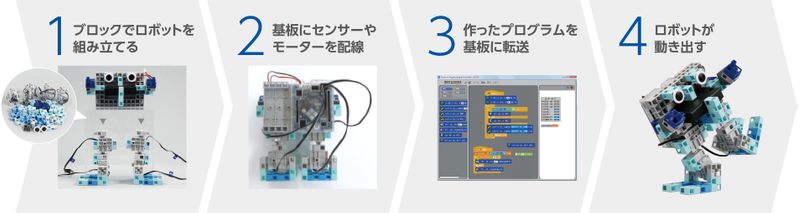 キットには「アーテックブロック」「ロボットパーツ」「プログラミングソフト」が含まれています。そのロボットプログラミングの製作過程は次のとおり。