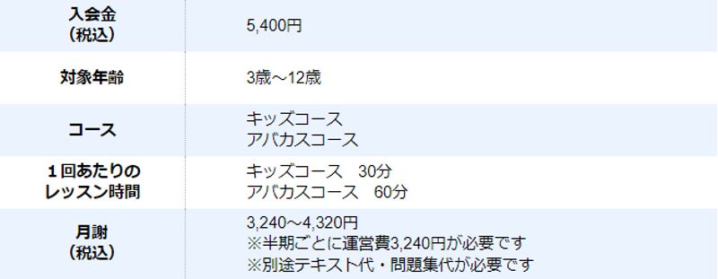 年少から入会でき、キッズ用のわかりやすいそろばんで、楽しみながら数の概念を理解するところからはじめられます。イラスト入りのオリジナルテキストで、女性講師がやさしくていねいに指導してくれるのが特徴です。