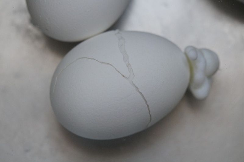 2.温めた牛乳瓶にゆで卵をのせ、氷水の方に漬けて冷やすと、ゆで卵が牛乳瓶の中に吸い込まれていきます