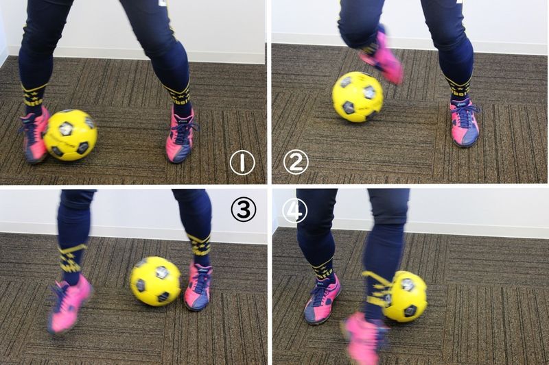 足の間の右足側にボールを置き、そのボールの上を右足をぐるっと1回まわしてから、右足で左足側に軽く蹴り、左足で受ける。今度は左足をぐるっと1回まわして左足から右足側に軽く蹴って、右足で受ける。これを最初はゆっくりでもいいので繰り返し、できるようになってきたら、速度を上げていきましょう。