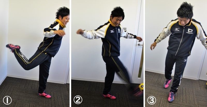 (1)→(2)の動作を繰り返し、パスの時よりも思いっきり足を振る練習をしましょう。