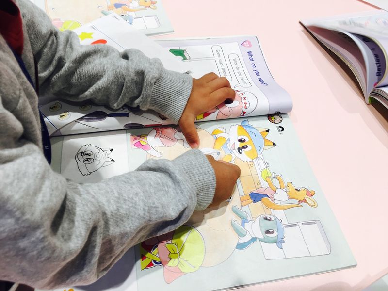 ひと通りカード取りゲームで盛り上がった後は、テキストブックでお勉強の時間です。Kinderクラスでは、1冊のテキストを約1年かけて学習。日常のさまざまなシーンで頻繁に登場する、25種類程度の言い回しを身につけることができるといいます。